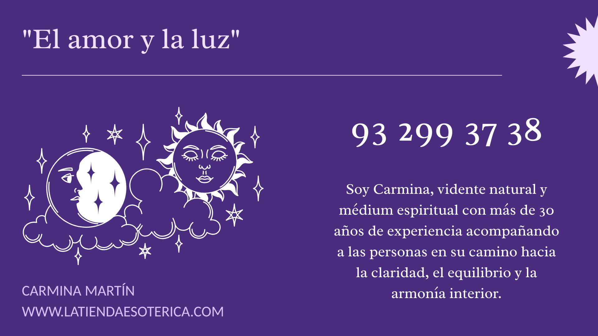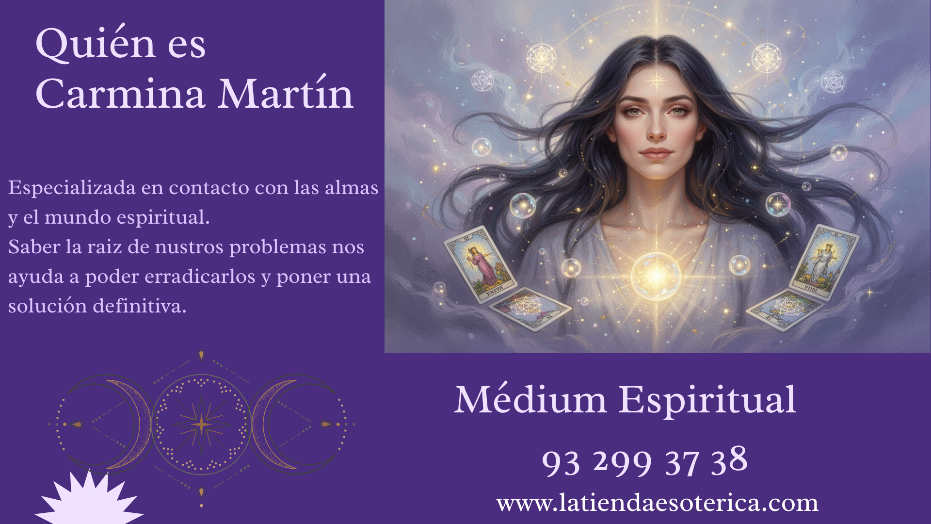 Soy Carmina, vidente natural y médium espiritual con más de 30 años de experiencia acompañando a las personas en su camino hacia la claridad, el equilibrio y la armonía interior.